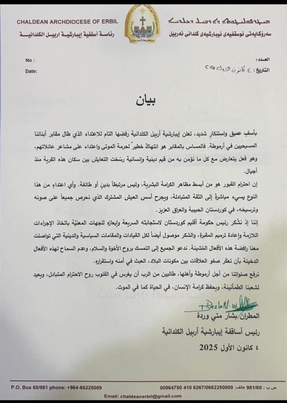 Both Patriarch Sako and Archbishop Warda urged the Kurdistan Region to conduct a professional, transparent investigation and prosecute those responsible. They emphasized that Christian communities must feel protected or risk another mass exodus.